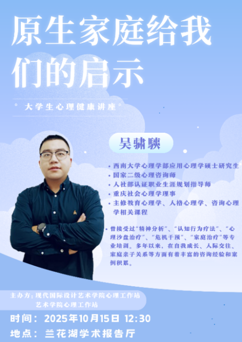 2025年10月15日,现代国际设计艺术学院心理工作站和艺术学院心理工作站联和主办的“原生家庭给我们的启示” 大学生心理健康讲座在兰花湖学术报告厅成功举办。讲座邀请到大学生心理健康教育与咨询中心吴骕騻老师主讲,两院心理专项老师、心理委员、寝室室长参加了此次讲座。