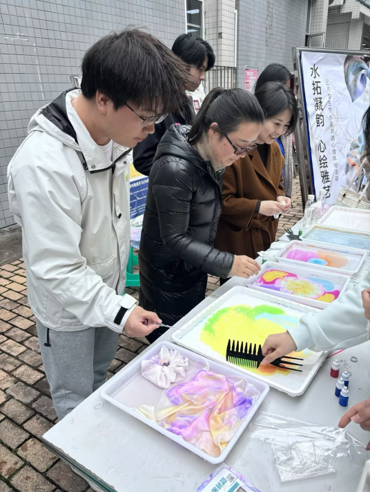 学校大学生心理健康与教育咨询中心吴骕騻老师、学院心理工作站李红雀老师、分团委李荣霞老师、党员服务站杨镔清老师、楼管会李小文老师到场与同学们互动交流,结合非遗传承与美育育人理念,鼓励女生们感受传统技艺、涵养审美情趣、展现青春风采。活动志愿者围绕水拓画历史、创作技法、作品呈现等方面进行了细致讲解与现场指导,同时,带领同学们沉浸式体验水面作画、拓印成型的完整流程。